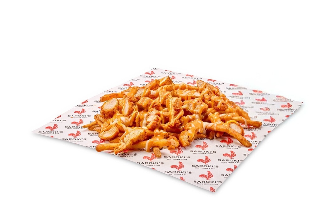 Potato Wedges topped with melted Mozzarella, our Hand-Battered Tenders, Bacon, and topped off with our house-made Saroki Sauce.